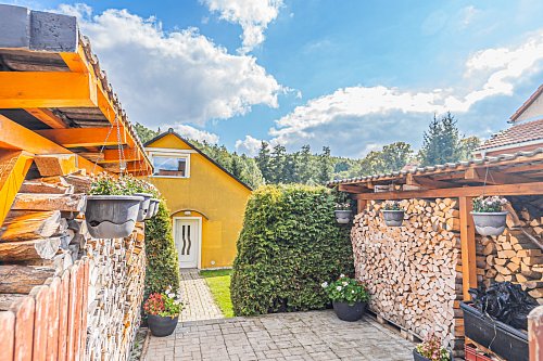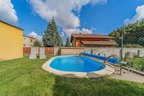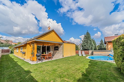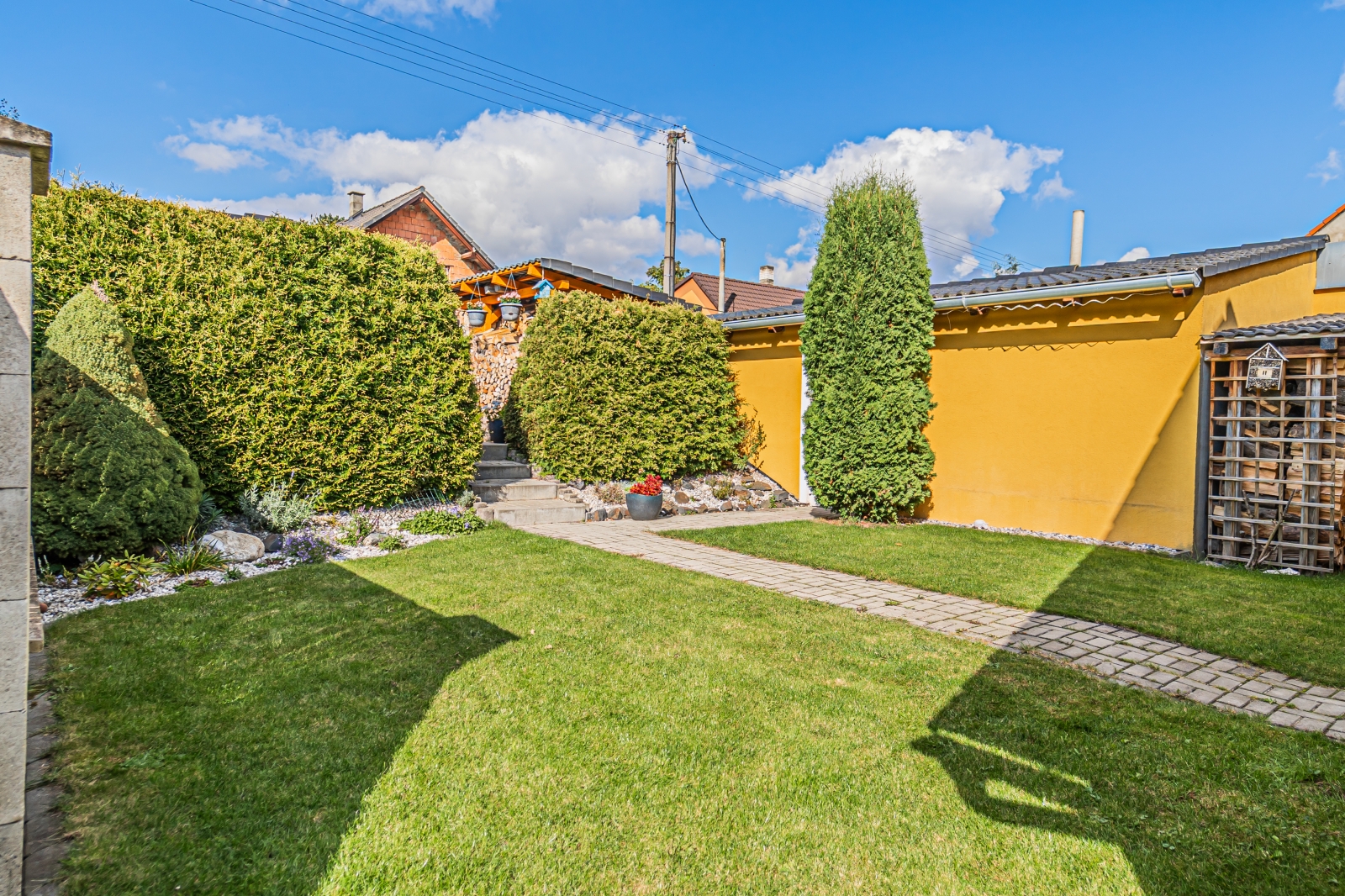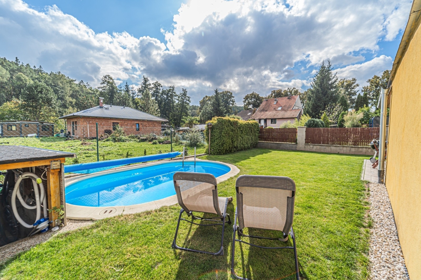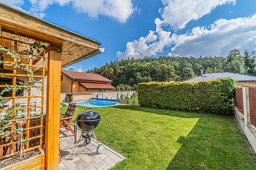 Na pečlivě udržované zahradě se nachází zapuštěný bazén a u něj malá dílna pro uložení zahradního náčiní. Součástí pozemku je dvougaráž, případně garáž pro jedno auto s dílnou, o celkové ploše 33,6 m². Parkování pro další dvě vozidla je možné pohodlně u pozemku. Zahrada je rovinatá, osázená okrasnými keři, se zpevněnými plochami ze zámkové dlažby a k zalévání slouží voda ze studny. Měsíční náklady na provoz domu jsou do 5.000,- Kč.