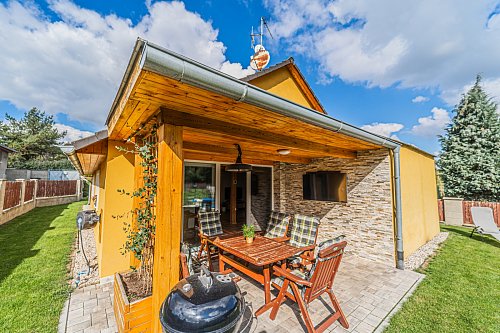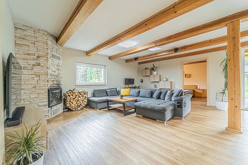 Dispozici tvoří tři ložnice a velkorysý obývací pokoj s krbovými kamny a průchodem do jídelny a kuchyně. Kuchyň je řešena do „L“ s ostrůvkem a indukční varnou deskou, nad ní je designová ostrůvková digestoř; k dispozici je vestavná trouba a mikrovlnná trouba. Z jídelny se přes francouzské dveře vychází na krytou terasu s posezením a TV, která plynule navazuje na udržovanou zahradu.