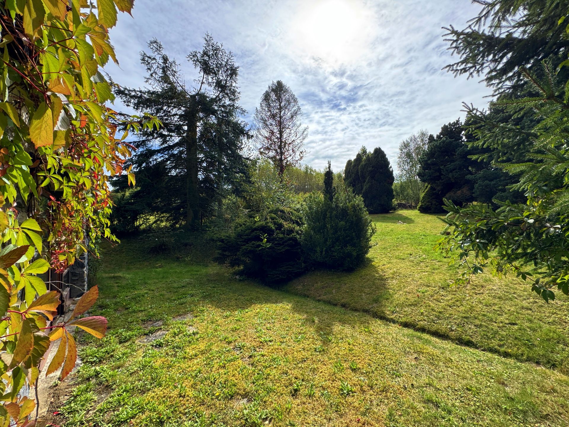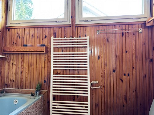 Dispozice 1. nadzemního podlaží zahrnuje sklad, garáž, chodbu, samostatné WC, kotelnu, prádelnu a velký obytný pokoj s krbem a francouzským oknem se vstupem na zahradu. Ve 2. nadzemním podlaží se nachází zádveří, předsíň, šatna, koupelna s WC, ložnice a obývací pokoj s kuchyňským koutem a vstupem na prostornou terasu s krbem a výhledem do zahrady; součástí je také balkon.